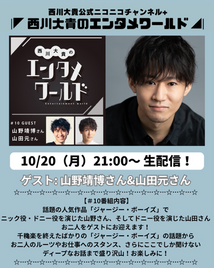 『西川大貴のエンタメワールド #10』10/20(月)21時~生配信!ゲストは山野靖博さん&山田元さんに決定!